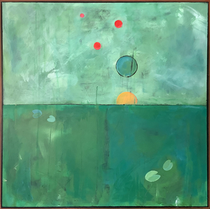 Een expressief geschilderd 'landschap' met water, vreemde bollen en waterlelie-bladeren (pompebladeren).